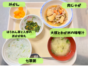 配膳の際に、『今日は1月7日、七草粥の日ですよ~』とお声かけすると