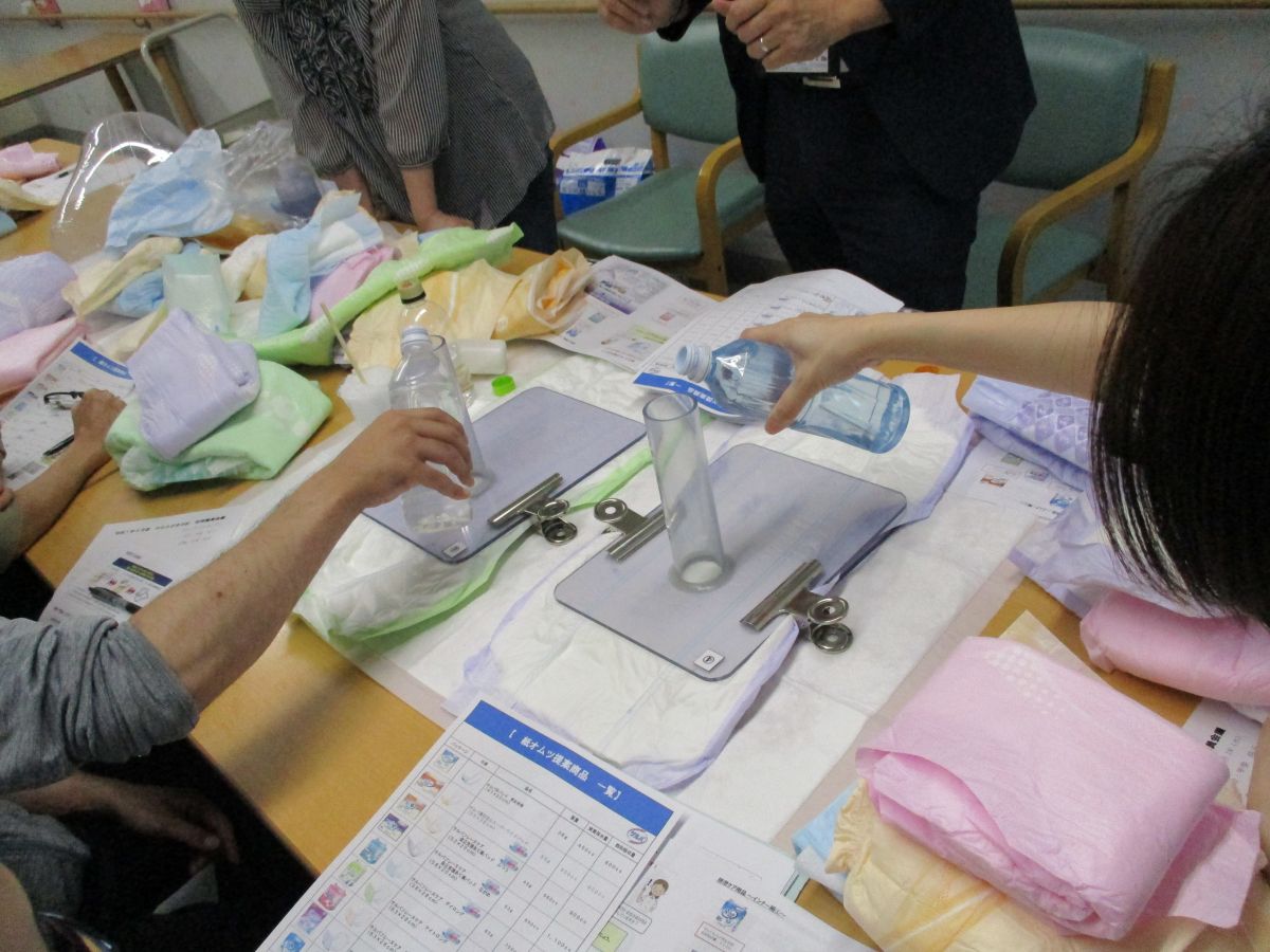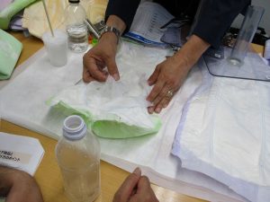 ↓その後は、実践でおむつの吸収の仕組みやおむつの構造、尿が流れる様子を学びました。