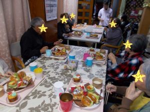 利用者様も笑顔で喜んで下さり、クリスマスの音楽が流れる中、楽しそうに過ごされました。 食事は、少し早めに豪華なクリスマスディナー!!皆さん、いつもよりたくさん召し上がられ、 「とても美味しかった~!」と喜んで頂きました。