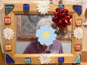 記念品はフォトフレームです。モザイクタイルや花、貝殻で飾り付けし