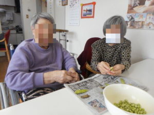 えんどう豆のおいしい季節ですね!剥いていただいた豆を使って、この日の昼食は豆ご飯です(*^-^*)