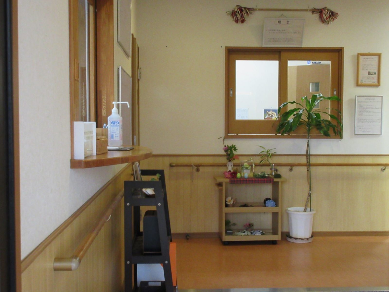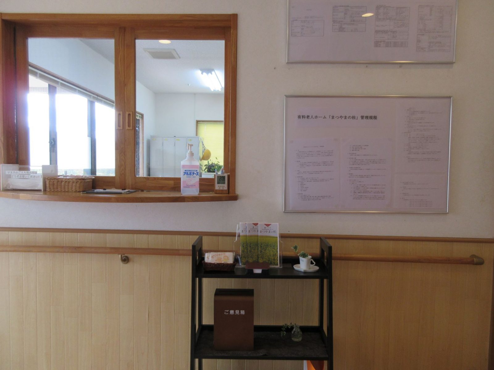 玄関入ってすぐです。こんにちは! 受付です。施設パンフレットを置いています。
