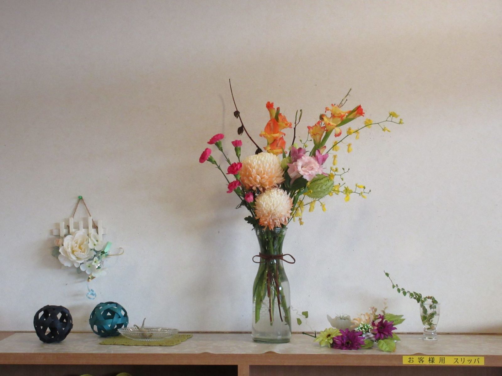 理念です。光って見辛いですね…すみません。 靴箱の上は季節のお花等をいつも飾るようにしています。