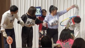 今年のゲームは「おててつないで仲良くリレー」。4人が手をつないだ状態で、フラフープとモールの輪を体を通してリレーしていきます。モールがなかなか体を通らず、苦戦しているチームも多かったようです。