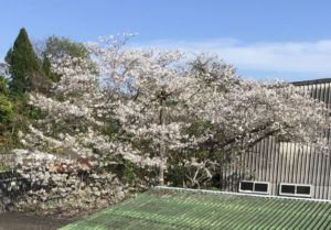 駐車場から見える満開の桜の下、入居者の皆さまが「きれいねぇ」「今年も見られてうれしい」と