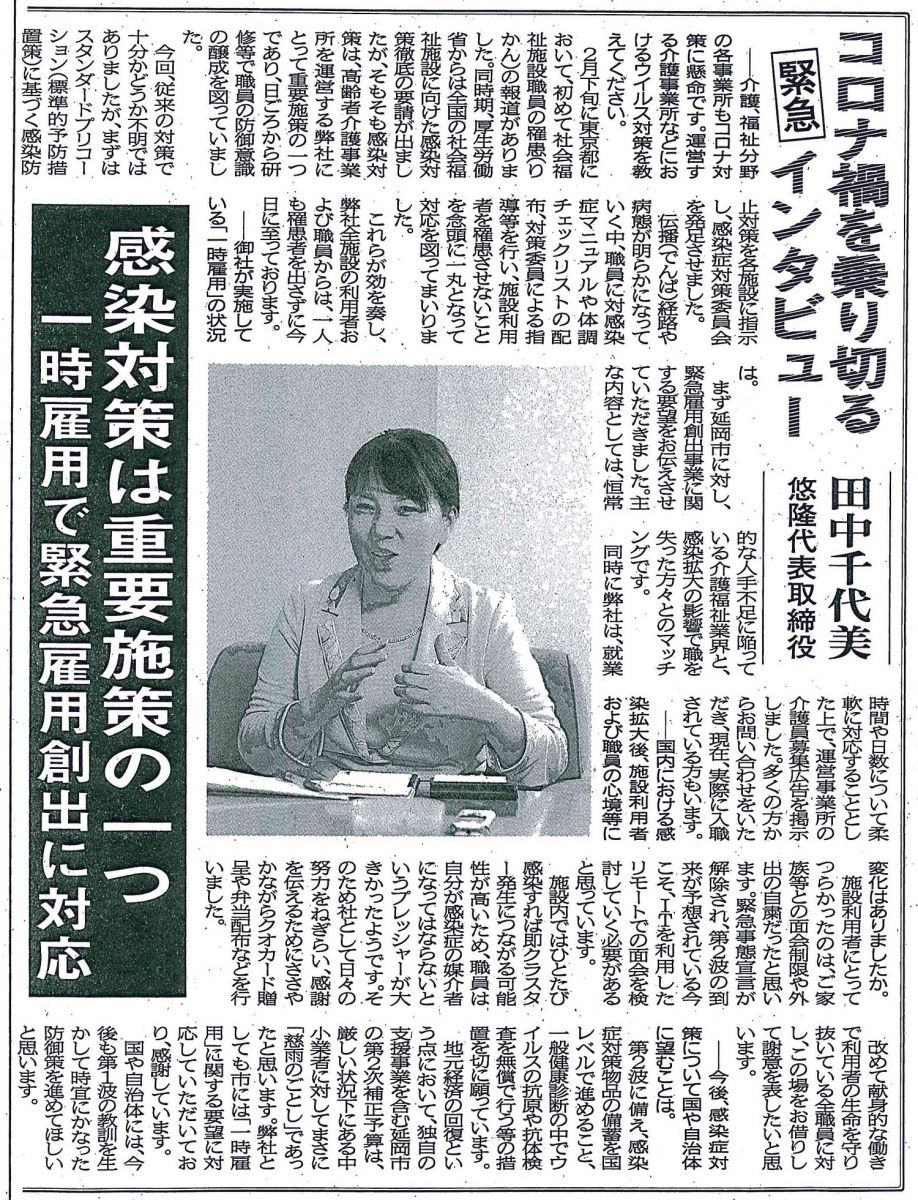 このたび弊社代表が夕刊デイリー新聞社のインタビュー取材を受け、令和2年7月7日、「コロナ禍を乗り切る緊急インタビュー」コーナーに記事が掲載されました。